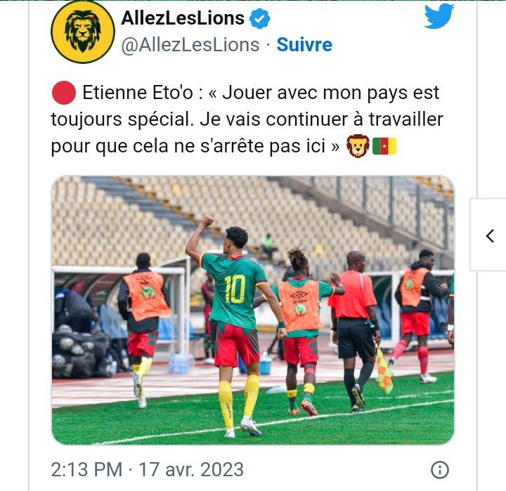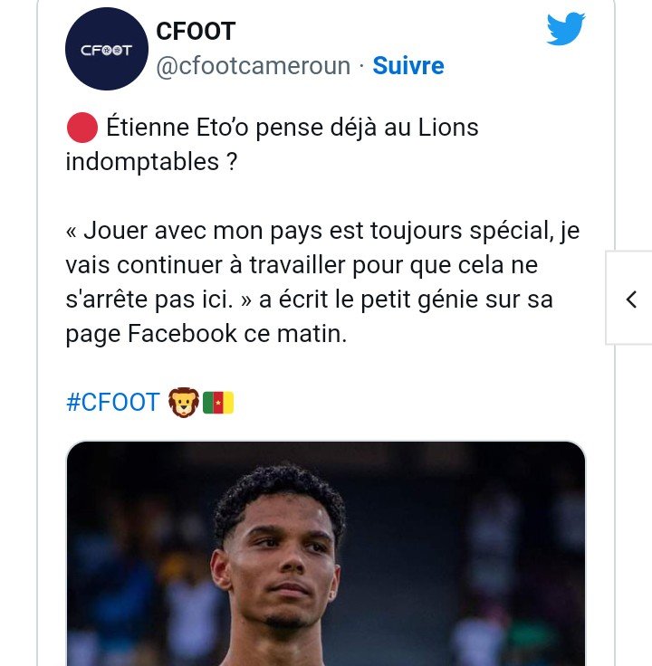 « Jouer avec mon pays est toujours spécial, je vais continuer à travailler pour que cela ne s’arrête pas ici. » a récemment lancé celui quibpeut jouer en tant que meneur de jeu ou attaquant. Son père, Samuel Eto’o, président de la Fédération camerounaise de football (FECAFOOT), serait fière de cette déclaration de son fils.