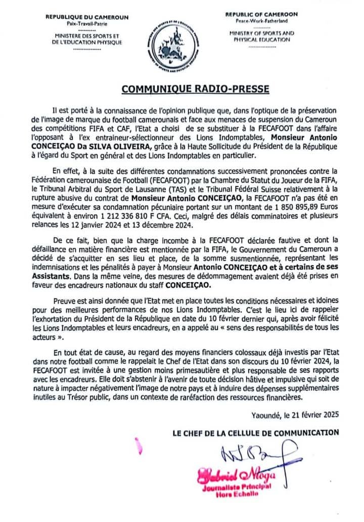 Dans un communiqué officiel, le gouvernement camerounais a justifié cette intervention par la nécessité de préserver la réputation du pays et d’éviter une crise dans le football national : « Il est porté à la connaissance de l’opinion publique que, dans l’optique de la préservation de l’image de marque du football camerounais et face aux menaces de suspension du Cameroun des compétitions FIFA et CAF, l’État a choisi de se substituer à la Fécafoot dans l’affaire l’opposant à l’ex entraîneur-sélectionneur des Lions Indomptables, Monsieur Antonio Conceiçao Da Silva Oliveira, grâce à la Haute Sollicitude du Président de la République à l’égard du Sport en général et des Lions Indomptables en particulier. »