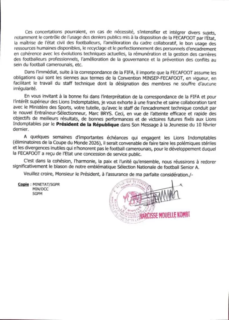 En réponse, le ministre des Sports, Narcisse Mouelle Kombi, a adressé une lettre à Samuel Eto’o, contestant les interprétations de la Fécafoot et défendant la légitimité de la nomination de Marc Brys par le gouvernement. Il a également évoqué la possibilité d’un renforcement du contrôle sur l’utilisation des fonds publics alloués à la Fécafoot, ainsi que d’autres sujets de coopération.