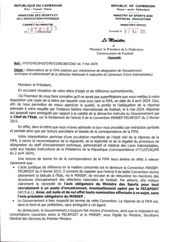 Dans un communiqué, la Fécafoot a répondu à l’interpellation de la FIFA en soulignant son engagement à respecter les règles et réglementations internationales en matière de désignation des membres du staff technique et administratif. Elle a également annoncé son intention de réviser la Convention liant le Ministère des Sports et de l’Education Physique à la Fécafoot, afin de clarifier les mécanismes de désignation du personnel.