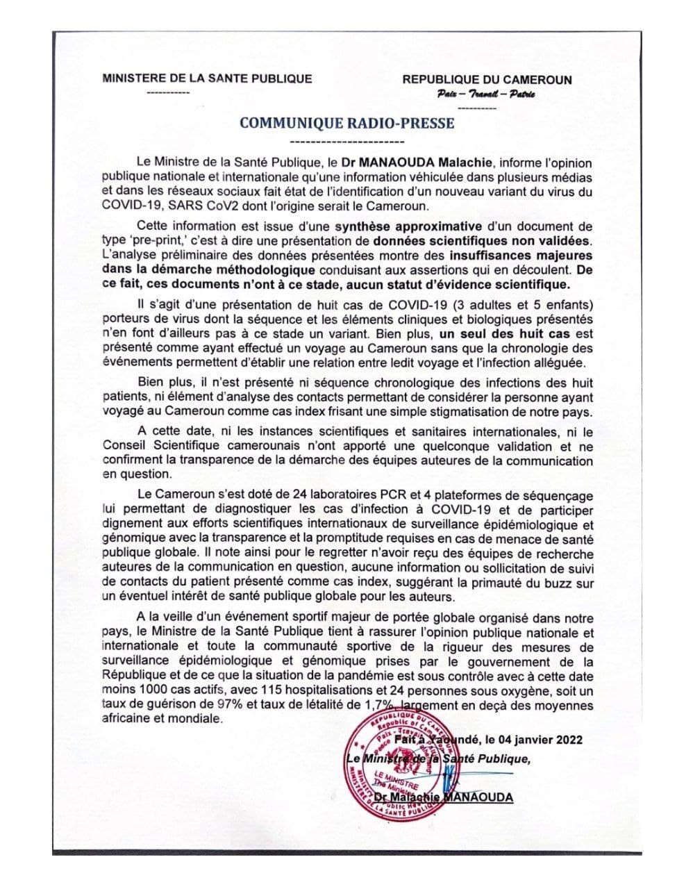 Le Ministre de la Santé Publique du Cameroun, le Dr MANAOUDA Malachie s’est officiellement prononcé sur l’information véhiculée dans plusieurs médias et dans les réseaux sociaux qui fait état de l’identification d’un nouveau variant du virus du COVID-19, SARS COV2 dont l’origine serait le Cameroun. C’est à travers un communiqué en date de ce mardi 04 janvier 2022. Lisant cette adresse, on peut relever les assurances du Ministère de la Santé Publique du Cameroun.