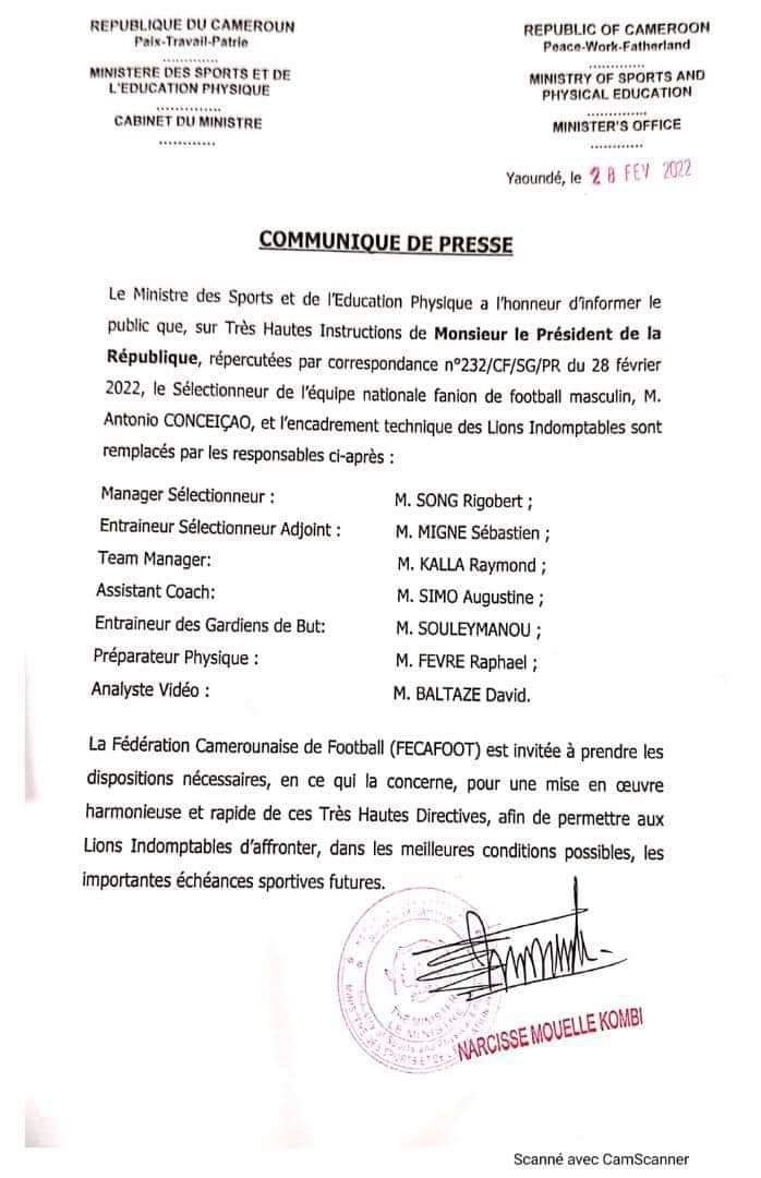 Pour rappel, le Ministère de la Jeunesse et du Sport n’était pas favorable, car cela revenait à verser de fortes indemnités aux anciens coach, mais au final ils ont cédé. Dans un communiqué publié ce lundi 28 février 2022, l’information a été dévoilée par le ministre. Une information selon laquelle, tout le staff de l’équipe nationale a été changé.