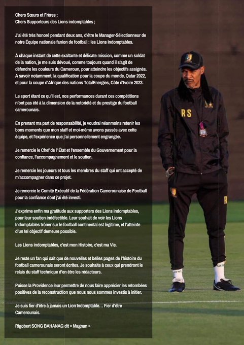 Dans son message, Rigobert Song a exprimé sa reconnaissance envers tous ceux qui ont été impliqués pendant son mandat en tant que sélectionneur. Il a souligné l’importance de l’expérience et des enseignements tirés de cette période, tout en exprimant sa fierté d’avoir eu l’opportunité de servir son pays en tant que coach des Lions Indomptables. Song a aussi souhaité bonne chance à la sélection camerounaise pour l’avenir, montrant ainsi son engagement continu envers le succès de l’équipe nationale.