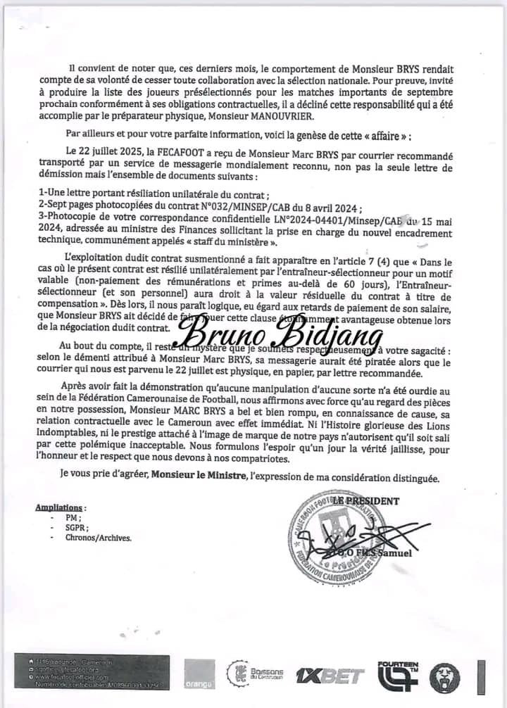 Face à ces accusations lourdes, la Fecafoot n’a pas tardé à réagir. Dans un nouveau communiqué publié jeudi 24 juillet 2025, elle a méthodiquement démonté la version du technicien flamand. Documents à l’appui, l’instance affirme avoir reçu un courrier physique, livré par EMS, contenant une lettre de démission signée de la main de Brys, ainsi que des copies de pièces administratives liées à son contrat.