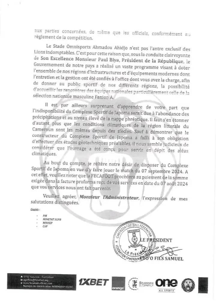 Puis de conlure : “Au bout du compte, je réitère notre désir de disposer du Complexe Sportif de Japoma en vue d’y faire jouer le match du 07 septembre 2024. A cet effet, veuillez noter que la FECAFOOT procèdera au paiement de la somme exigée dans la facture proforma reçue de vos services en date du 07 août 2024.”.