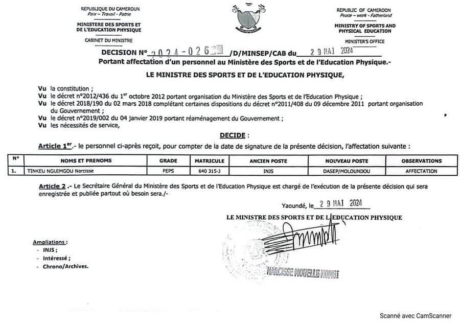 La saga autour de la sélection nationale de football du Cameroun continue avec un nouvel épisode de tensions entre la Fédération camerounaise de football (Fecafoot) et le ministère des Sports (MINSEP). Narcisse Tinkeu, récemment nommé préparateur physique par intérim par la Fecafoot sous la présidence de Samuel Eto’o, se voit désormais affecté à la Délégation Départementale des Sports et de l’Éducation Physique (DASEP) de Moloundou, dans la région de l’Est, par le MINSEP.