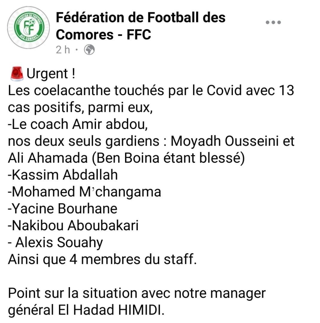 A quelques jours d’un affrontements décisif en huitième de finale face au Cameroun, l’équipe des Comores est gravement touchée par la Covid-19. Une très mauvaise nouvelle pour l’équipe des Comores avant d’aborder ce match contre le pays hôte. En effet, 13 cas positifs ont été annoncés dans le camp des Comoriens qui seront donc décimés pour la rencontre. L’information a été confirmée par la fédération de football des Comores à travers une publication.