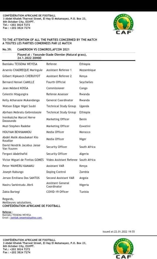 Ci dessous en image tout les officiels du match Cameroun vs Comores