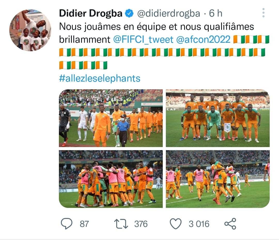 Ce jeudi 20 janvier 2022, la Côte d’Ivoire a validé sa qualification pour les huitièmes de finale de la Can 2021 en venant brillamment à bout d’une équipe de l’Algérie qui n’a pas été à la hauteur. La performance XXL des ivoiriens n’est pas passée inaperçu aux yeux des observateurs du football. Même après sa réaction à chaud, la légende ivoirienne, Didier Drogba continue de savourer la belle victoire et la qualification de la Côte d’Ivoire sur les réseaux sociaux. Sur Twitter, tout comme sur Facebook, l’ancien buteur de la Côte d’Ivoire a posté une publication en l’honneur des Éléphants qui enflamme la toile. Son post fait allusion à un célèbre morceau de Dj Kerozen, ce qui a fait déchaîner les passions.