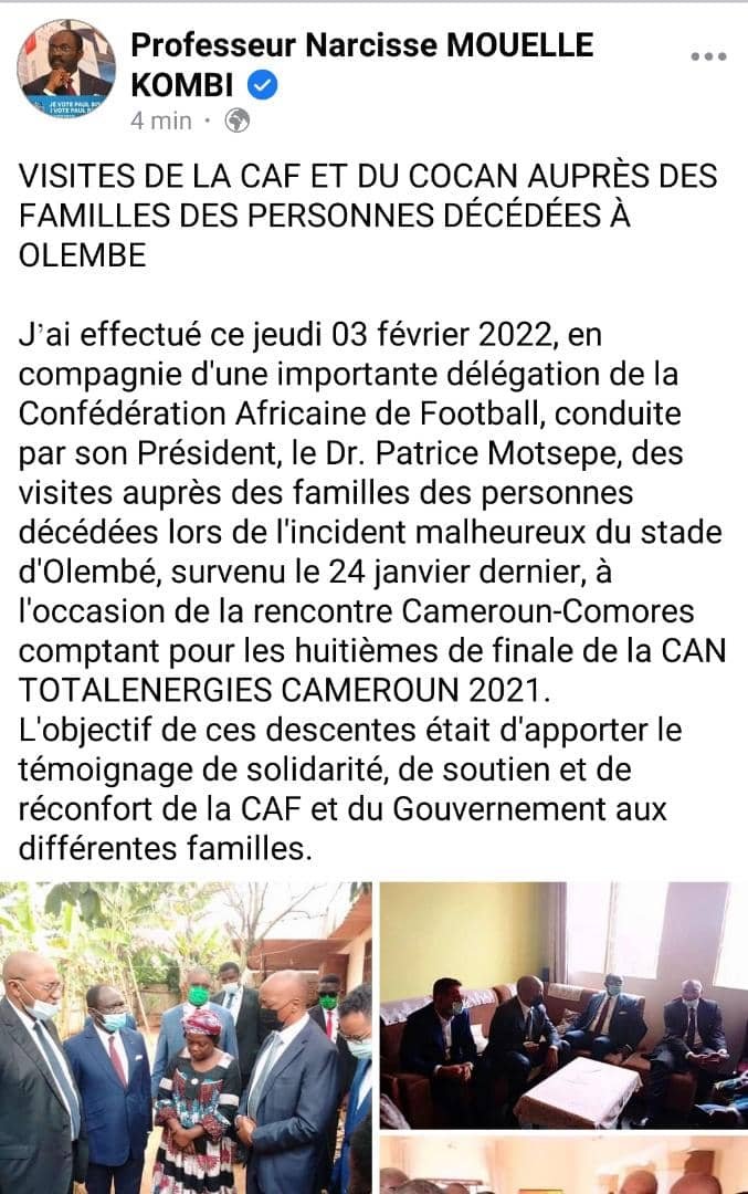 Le lundi 24 janvier 2022, 8 personnes sont mortes suite à un mouvement de foule au Stade d’Olembe en marge du 8e de finale de la Can 2021 entre le Cameroun et les Comores (2-1.) Suite à ce drame, le ministre des Sports camerounais Narcisse Mouelle Kombi, accompagné du président la Confédération africaine de football (CAF), Patrice Motsepe ont rendu visite ce jeudi 03 février 2022, aux familles endeuillées. L’information a été rendu publique parle ministre des Sports camerounais Narcisse Mouelle Kombi à travers une publication sur sa page facebook.