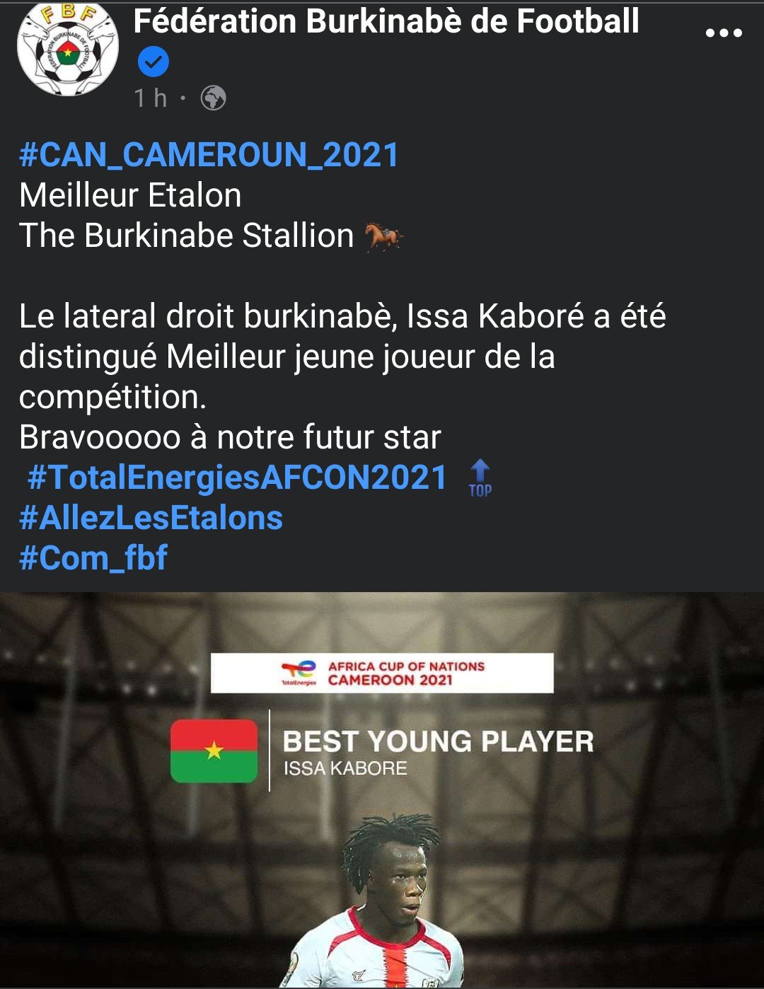La Can 2021 a pris fin ce dimanche 06 février 2022, avec le premier sacre de l’histoire du Sénégal. A la fin, les récompenses ont été attribuées aux joueurs qui se sont distingués dans la compétition. Et dans ce lot, le talentueux joueur du Burkina Faso, Issa Kaboré a été désigné meilleur jeune joueur de la compétition. Une information révélée par la fédération Burkinabè de football sur sa page Facebook. Issa Kaboré a joué un rôle prépondérant dans le parcours du Burkina Faso, sa récompense est donc méritée.