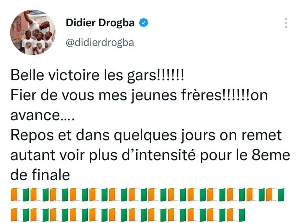 Sur Twitter, Didier Drogba a montré toute sa fierté aux Éléphants à travers un message posté. Ci dessous en image la publication de Didier Drogba :