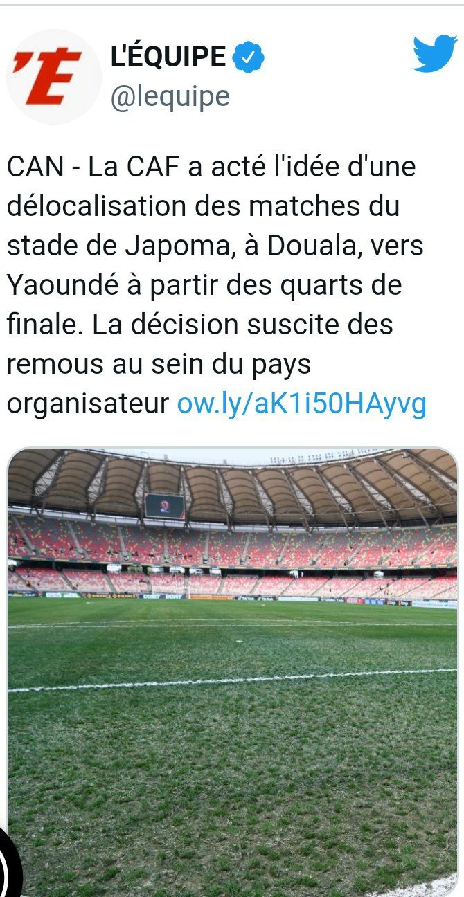 Ainsi, selon L’Équipe, la Confédération Africaine de Football a officiellement annoncé que l’antre phare de Douala ne sera plus utilisé à partir des quarts de finale. La pelouse du stade est désormais considérée comme presque impraticable et contraint ainsi le comité d’organisation à opérer à plusieurs changements dans la programmation des prochaines rencontres.