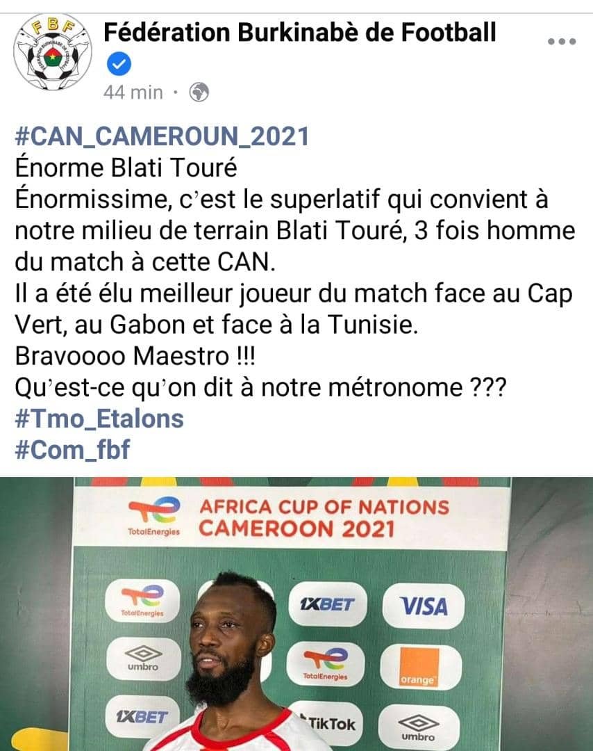 Le Burkina faso en demi-finale de la Can 2021, c’est un pari très risqué avant le début de la compétition. Pourtant, les étalons sont bel et bien présents dans le dernier carré de la compétition après leur victoire sur la Tunisie 1 but à 0 en quarts de finale. Un homme se distingue spécialement dans le parcours du Burkina Faso depuis le début de la compétition. Il s’agit du milieu de terrain Blati Touré. Il est une force majeure de la sélection burkinabè dans cette Can. Blati Touré l’a encore prouvé en sortant une prestation XXL face à la Tunisie et a été élu homme du match, et pour donc la 3e fois lors de cette Can 2021. Une prestation qui n’a pas échappé à la fédération Burkinabè de football qui a rendu hommage au joueur sur les réseaux sociaux notamment sur Facebook à travers une publication.