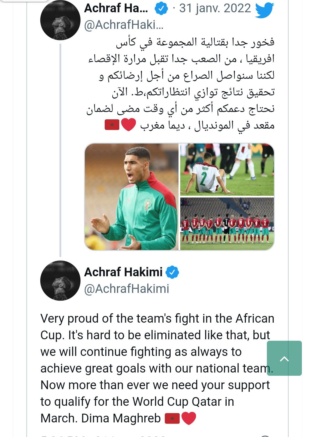 « Très fier du combat de l’équipe en Coupe d’Afrique. C’est difficile d’être éliminé comme ça, mais nous continuerons à nous battre comme toujours pour atteindre de grands objectifs avec notre équipe nationale. Aujourd’hui plus que jamais, nous avons besoin de votre soutien pour nous qualifier pour la Coupe du Monde du Qatar en mars ».