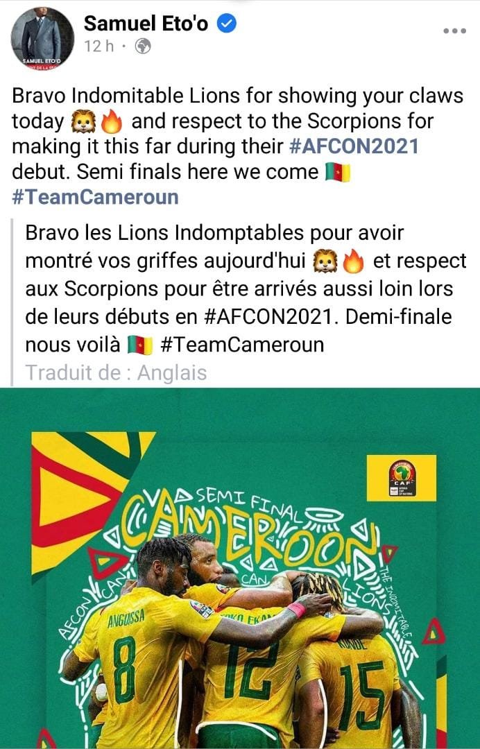 Le Cameroun s’est imposé avec la manière en quarts de finale de la Can 2021 face à la Gambie. Une victoire par 2 buts d’écart sans encaisser envoie les lions indomptables en demi-finale de la compétition. Le président de la fédération camerounaise de football, Samuel Eto’o a assisté à la prestation des lions. Visiblement content du combat livré par les joueurs du Cameroun, Samuel Eto’o a réagi à cette qualification sur les réseaux sociaux. Su sa page facebook, Samuel Eto’o a fait une publication dans laquelle il félicite les siens tout en montrant du respect à l’adversaire du jour.