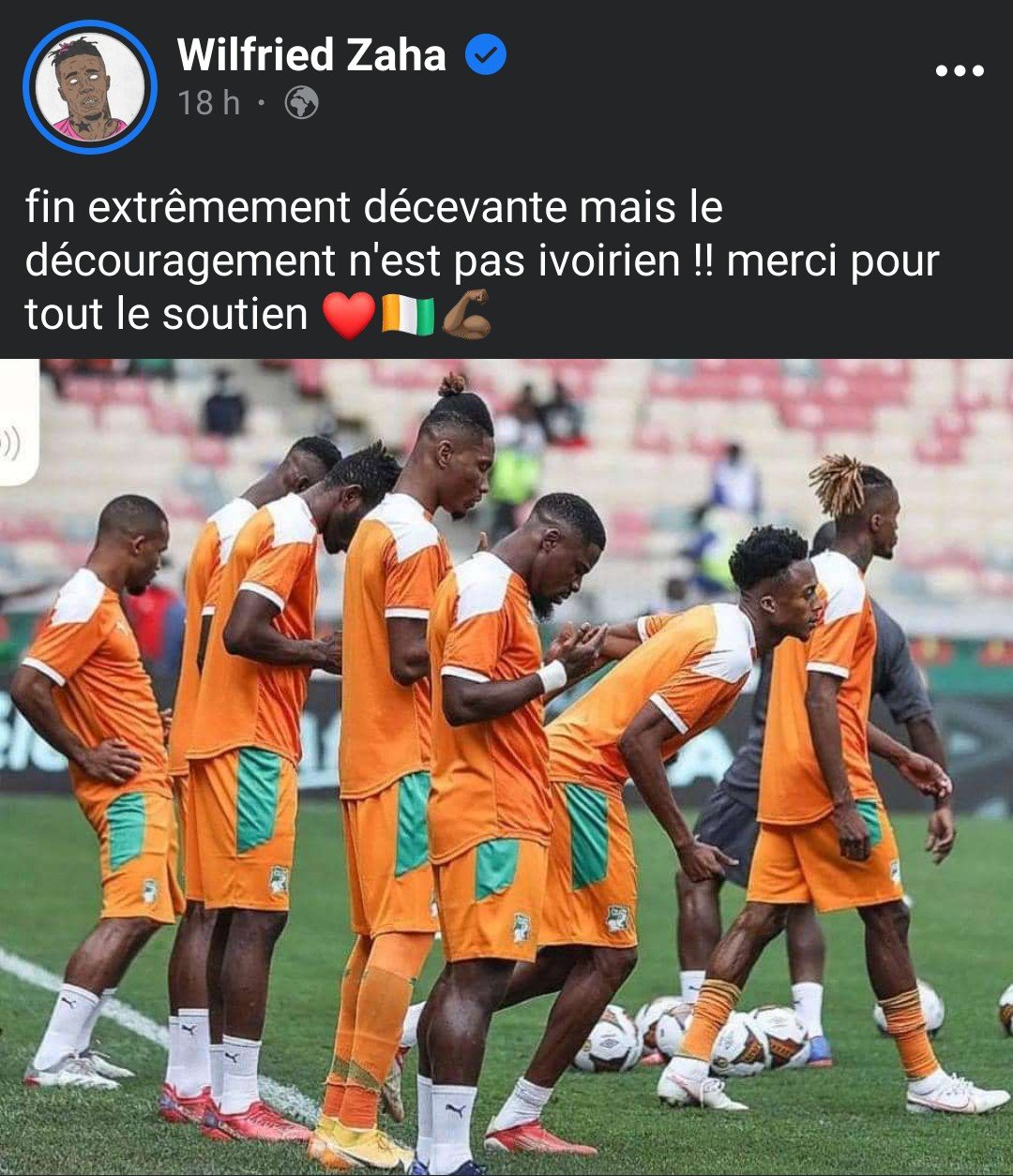 « Fin extrêmement décevante mais le découragement n’est pas ivoirien. Merci pour tout le soutien« , a posté le joueur de Crystal Palace sur sa page Facebook comme le montre l’image ci dessous