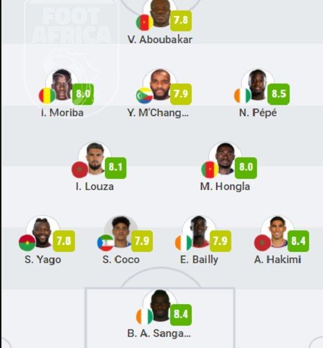 Cette équipe type des 8e de finale compte, également, dans ses rangs les deux marocains Imrane Louza et Achraf Hakimi, ainsi que le défenseur de la Guinée Equatoriale, Saul Coco, le latéral burkinabé Steeve Yago, le milieu défensif camerounais Martin Hongla, l’ailier guinéen Ilaix Moriba, le meneur de jeu comorien Youssouf M’Changama, et l’attaquant camerounais Vincent Aboubakar.