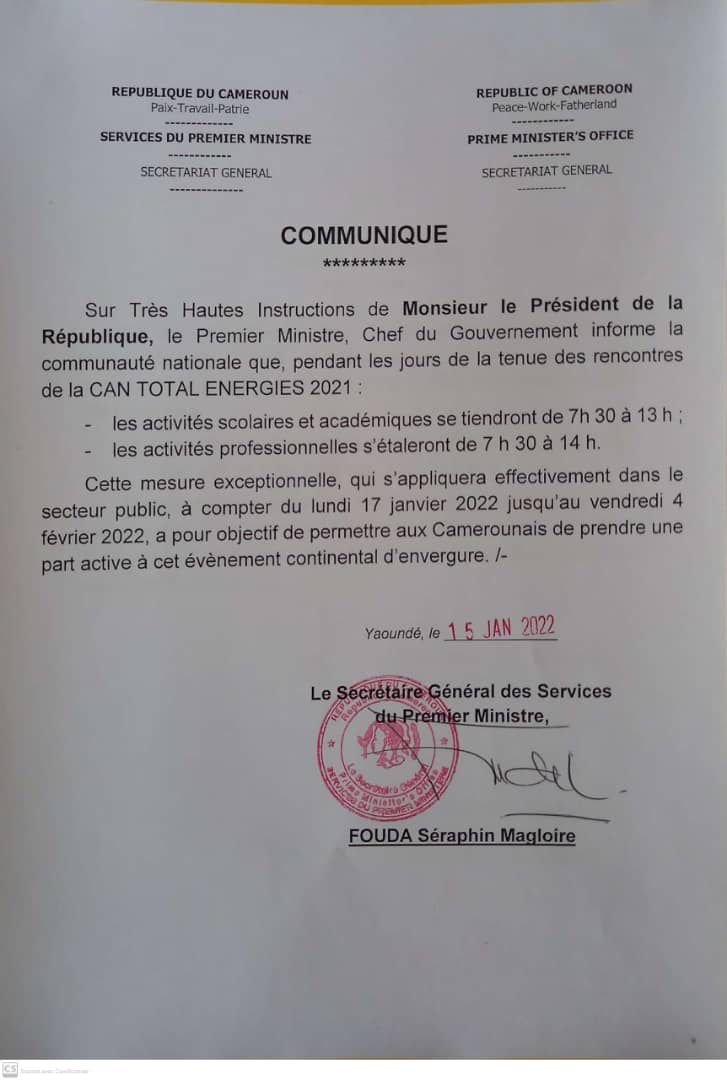 Dans l’objectif de permettre aux camerounais de prendre une part active à la Can 2021, le gouvernement du Cameroun a pris la décision de réajuster les horaires scolaires et de travail. L’information a été révélée à travers un communiqué des services du premier ministre.