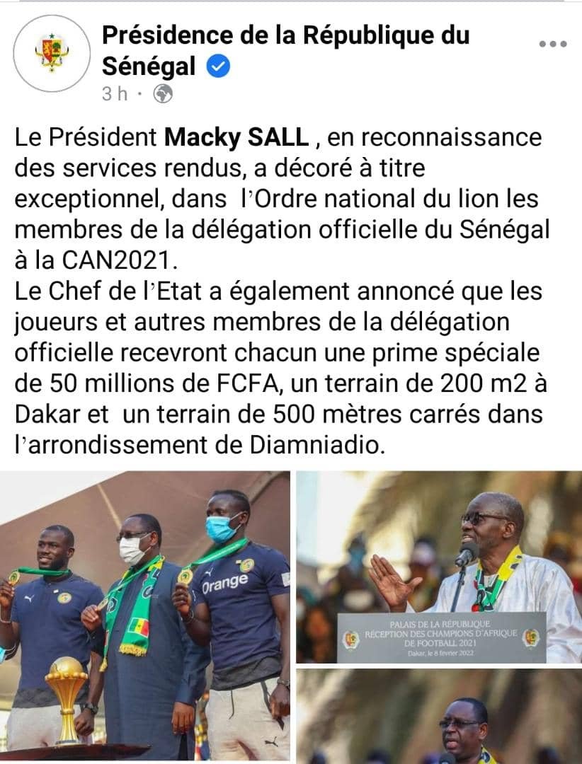 Dans une publication sur la page facebook de la présidence du Sénégal, à travers une publication toutes les informations nécessaires sur le geste du président Macky SALL à la délégation sénégalaise de la Can 2021, ont été mentionnées.