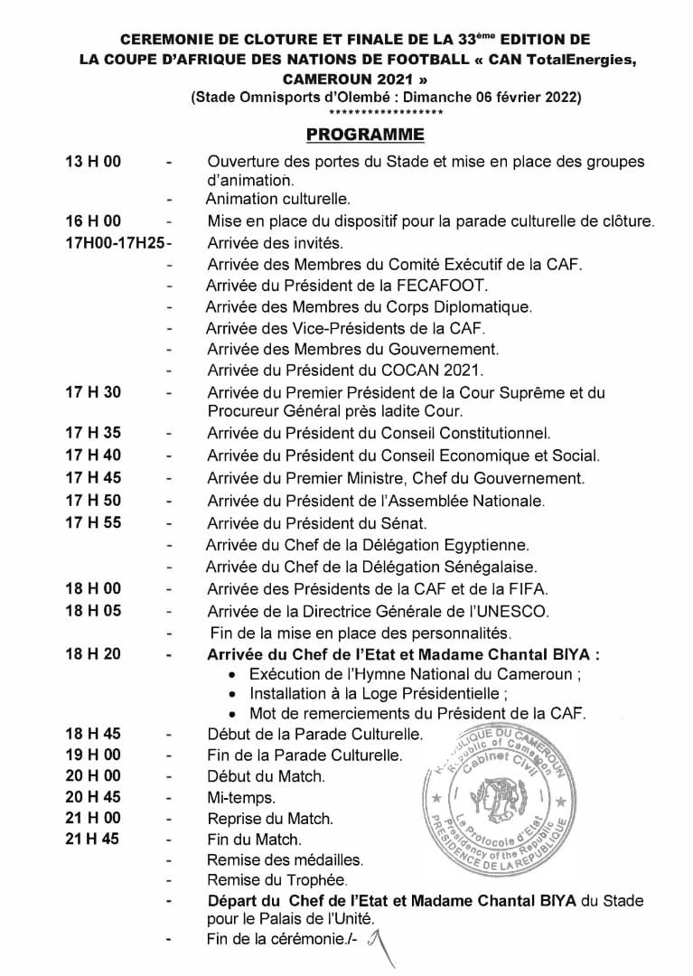 La Can 2021 prend fin ce Dimanche 06 février 2022 avec la finale de la compétition qui sera disputée entre le Sénégal et l’Égypte. Découvrez le programme de tout ce qui a été prévu pour cette dernière journée de la Can au Cameroun.