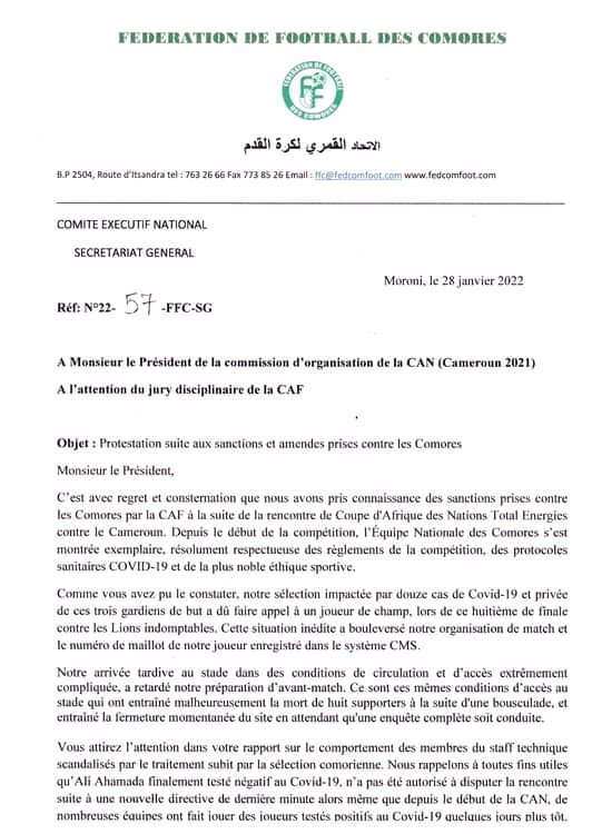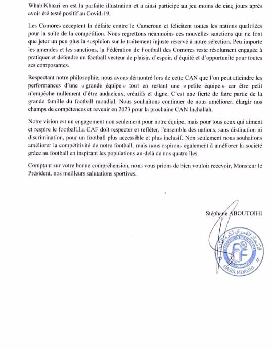 Ci-dessous en image l’intégralité de la lettre de la fédération de football des Comores