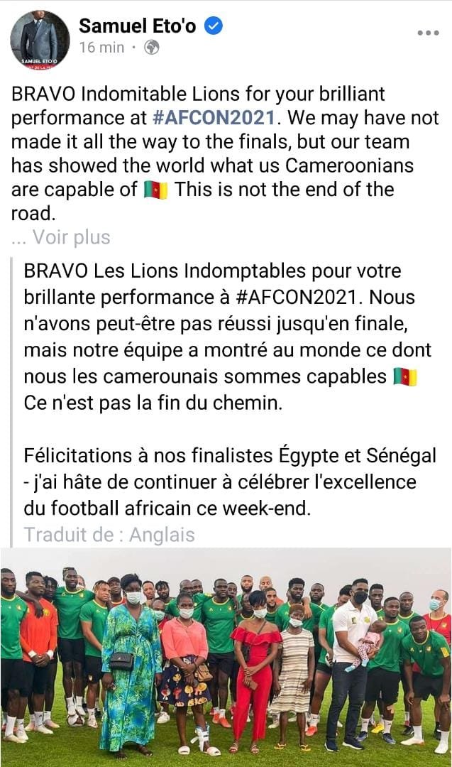 Le Cameroun ne sera pas le vainqueur de la Can 2021, organisée au pays des lions indomptables. Éliminés en demi-finale de la compétition par l’Égypte à la séance des tirs au but, les Camerounais ont vu leur rêve de triompher à domicile prendre fin. Au lendemain de cette élimination, Samuel Eto’o, le président de la fédération camerounaise de football a réagi à travers une publication sur sa page Facebook pour encourager ses compatriotes et féliciter les finalistes.