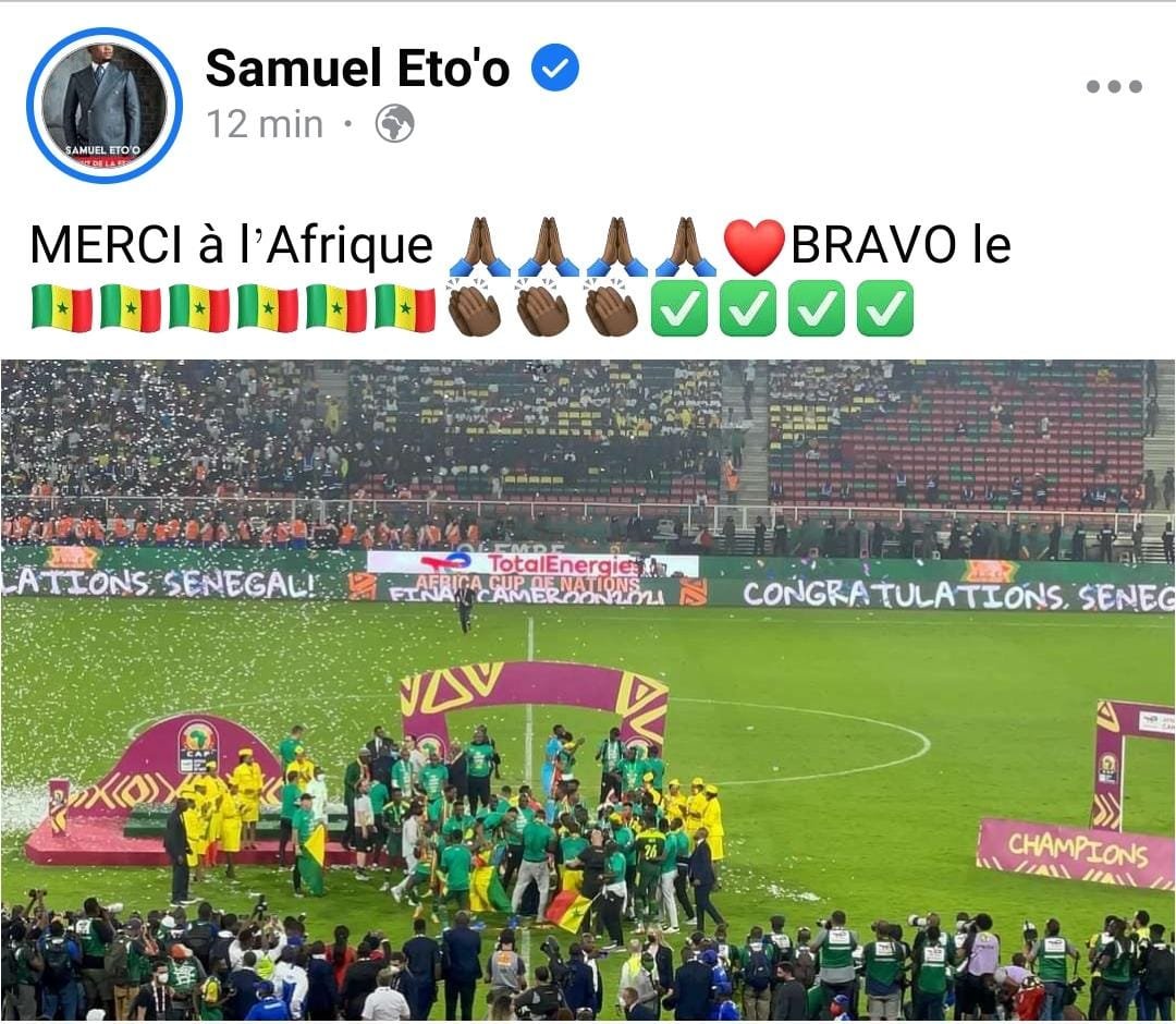 Après une très longue attente, le Sénégal a fini par conquérir son premier titre continental. Les Lions de le Teranga ont vaincu le signe indien en disposant de l’Egypte. Ce ne fut pas sans mal, mais le triomphe était mérité. Le Sénégal a conquis sa première CAN ce dimanche 06 février 2022 en venant à bout de l’Egypte à l’issue de l’épreuve des tirs au but. Après l’exploit des sénégalais, le président de la FECAFOOT, Samuel Eto’o a réagit sur les réseaux sociaux, notamment sur sa page Facebook dans la foulée.
