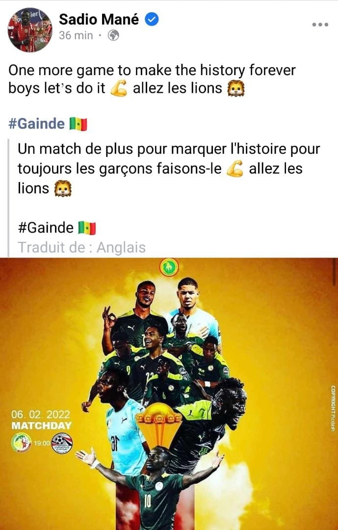 Sadio Mané et le Sénégal vont disputer la finale de la Can 2021 ce dimanche 06 janvier 2022 face à l’Egypte. Les sénégalais rêvent de remporter le titre pour la première fois de leur histoire après avoir échoué deux fois en finale (2002 et 2019). Avant cette rencontre, l’attaquant du Sénégal a livré une réaction à travers une publication sur facebook à quelques heures de cette finale.