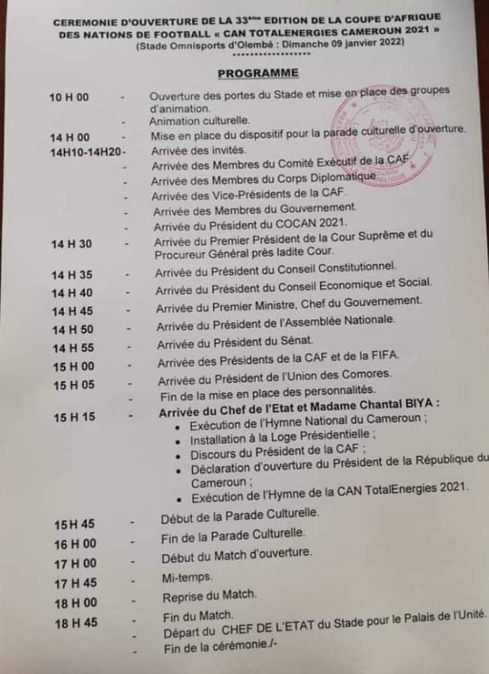 Le Dimanche 09 janvier 2022, la Can 2021 va débuter au Cameroun. A cet effet, la cérémonie d’ouverture de la compétition est riche en évènement. Découvrez le programme complet de la cérémonie d’ouverture de la Can 2021.