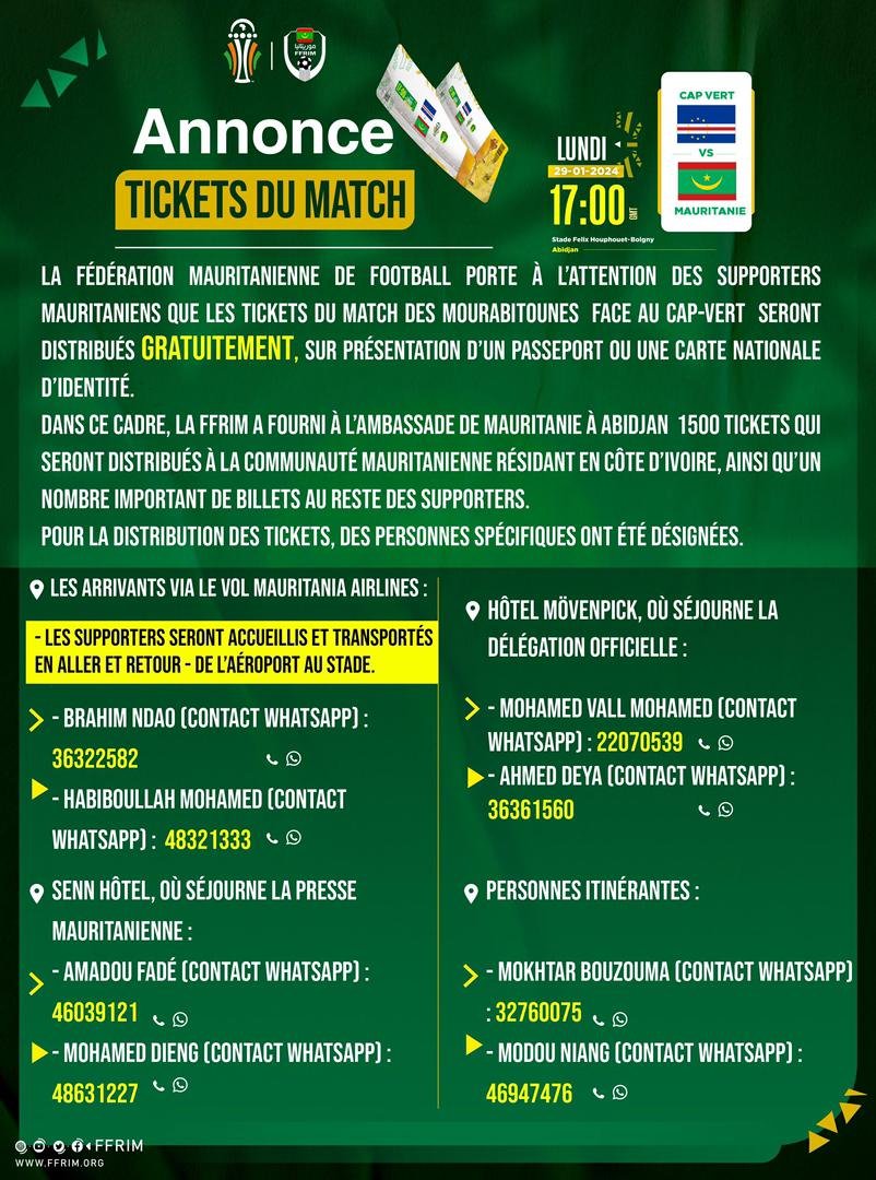 La Mauritanie affronte en 8ᵉ de finale ce lundi 29 janvier 2029 à 17h GMT au stade Félix Houphouët-Boigny d’Abidjan le Cap-Vert. Pour cette rencontre historique pour le peuple mauritanien, la Fédération mauritanienne de football fait geste utile.