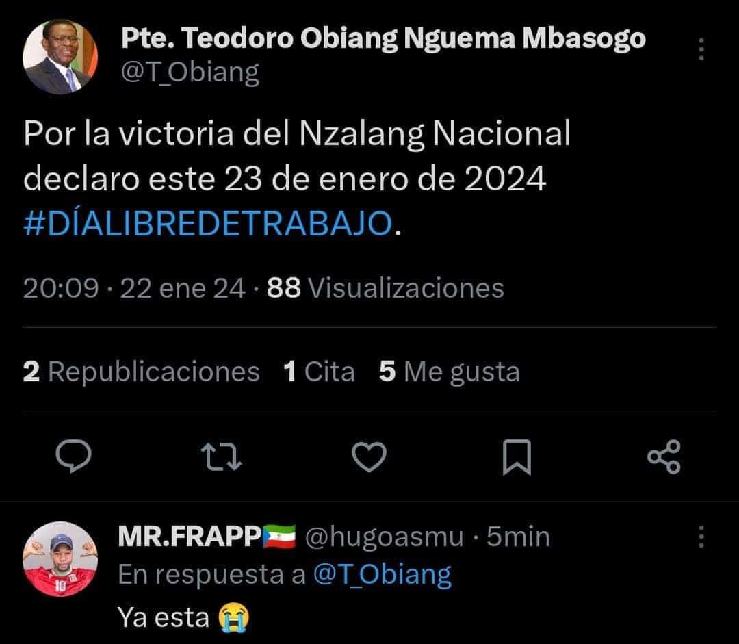À la suite de la victoire éclatante de l’équipe nationale de football de la Guinée Équatoriale contre la Côte d’Ivoire ce 22 janvier 2024, les bonnes nouvelles s’enchaînent. Le président Teodoro Obiang Nguema a annoncé que la journée du 23 janvier 2024 serait déclarée fériée dans tout le pays.