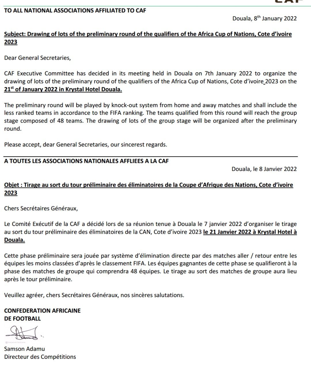 La CAF pense déjà à la Can 2023. Lors d’une réunion tenue le 07 janvier 2022 à Douala, elle a décidé d’organiser le tirage au sort du tour préliminaire des éliminatoires de la Can 2023 le 21 janvier 2022 à Krystal hôtel de Douala. L’information a été confirmé à travers une lettre du directeur des compétitions, Samson Adamu ce 08 janvier 2022.