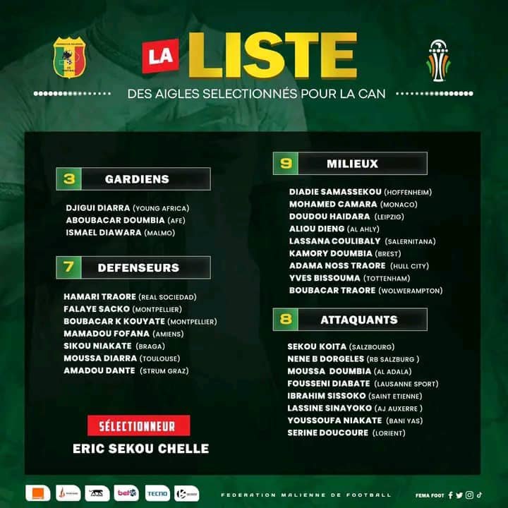 Le sélectionneur de l’équipe nationale du Mali, Eric Chelle, a levé le voile ce mardi sur la composition finale des 27 joueurs qui représenteront les Aigles lors de la Coupe d’Afrique des Nations 2023, prévue du 13 janvier au 11 février 2024.