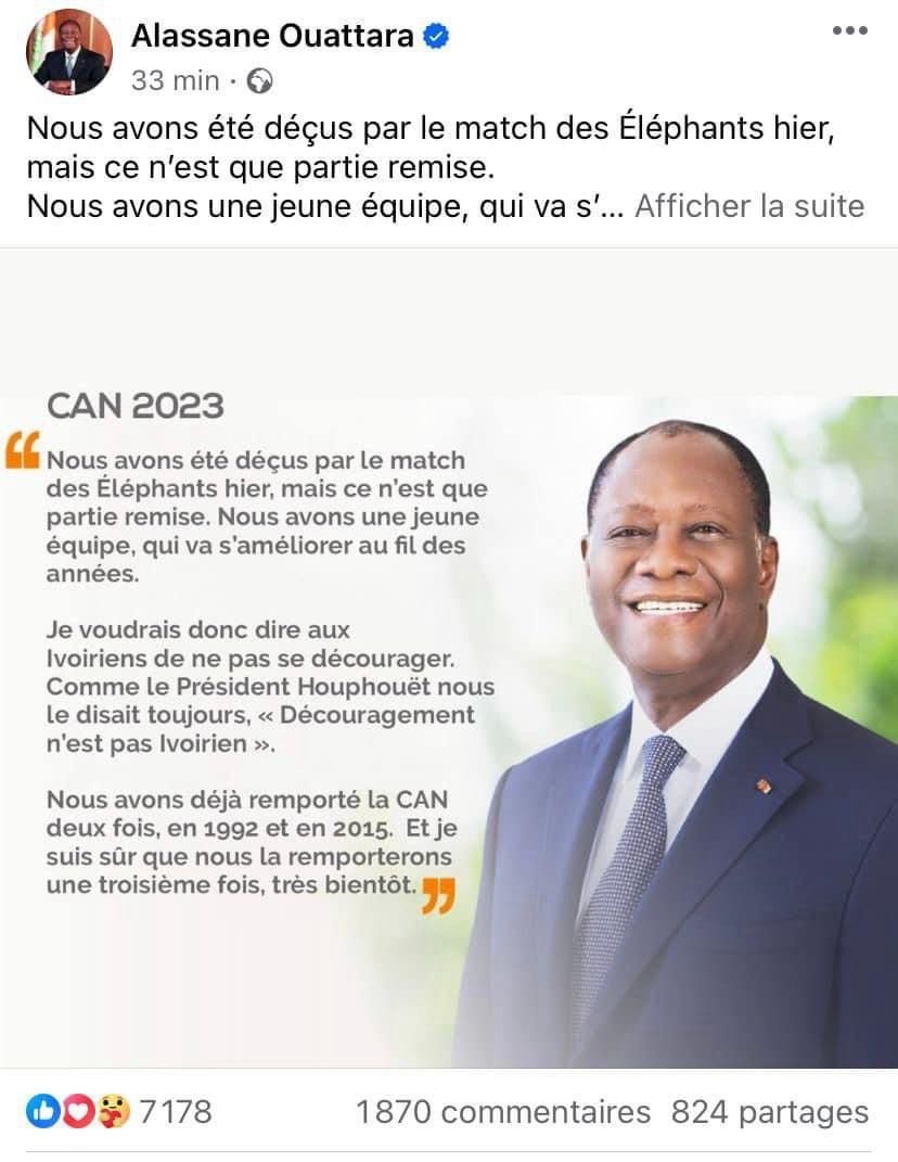 Après une défaite désastreuse 4-0 contre la Guinée Équatoriale, mettant la Côte d’Ivoire au bord de l’élimination, le président Ouattara a pris la parole dans une publication en ligne le 23 janvier 2024. Malgré le revers, il a encouragé les Ivoiriens à rester optimistes, soulignant la jeunesse de l’équipe et sa capacité à s’améliorer avec le temps.