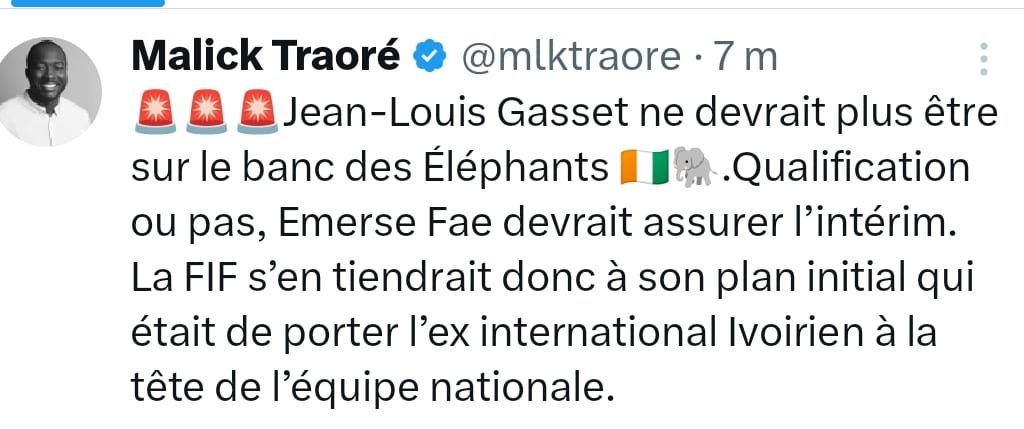 Des changements significatifs semblent se profiler du côté de l’encadrement technique des Éléphants de la Côte d’Ivoire à la CAN 2023. Selon les informations fournies par le journaliste Malick Traoré, Jean-Louis Gasset devrait quitter le banc, indépendamment du résultat de la qualification, et Emerse Fae prendrait les rênes par intérim.