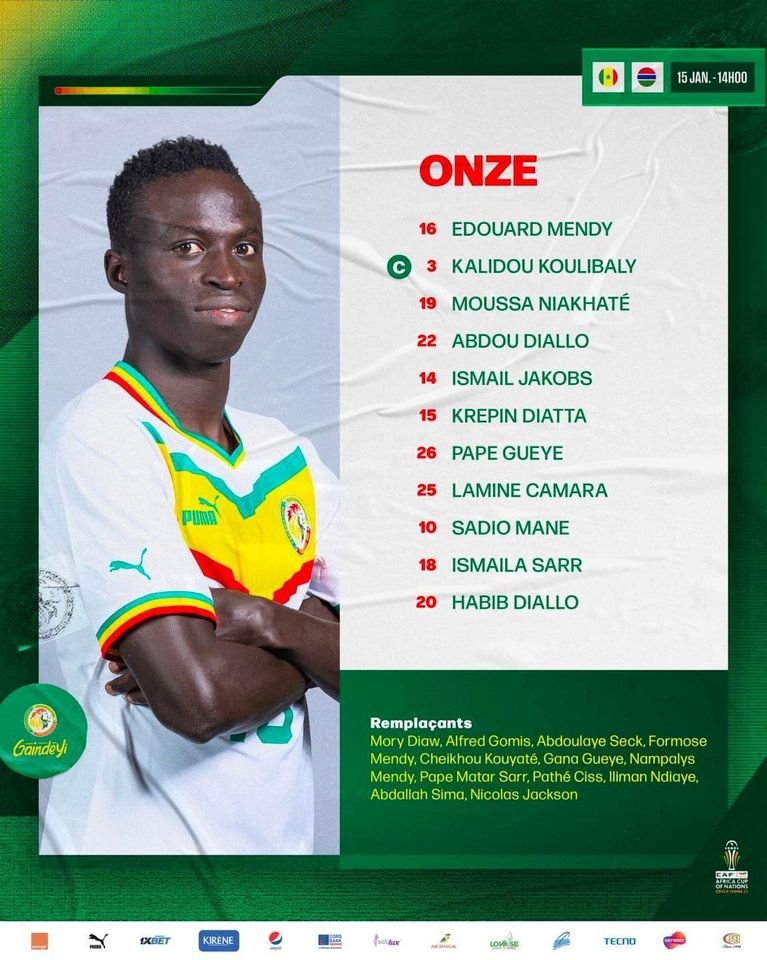 Le Sénégal et la Gambie entrent en scène ce lundi 15 janvier 2024, marquant leur début dans la 34e édition de la CAN en Côte d’Ivoire. À quelques minutes du coup d’envoi, les compositions de départ pour les deux équipes ont été révélées.
