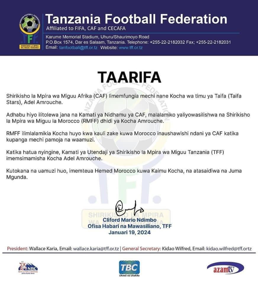 La Fédération Tanzanienne de Football a réagi rapidement aux sanctions de la CAF en prenant la décision de licencier Adel Amrouche. Dans un communiqué publié sur sa page Facebook officielle, la fédération a expliqué que les propos tenus par l’entraîneur étaient inacceptables et ont nui à l’image du football tanzanien.