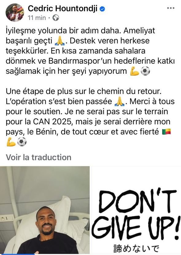 « Une étape de plus sur le chemin du retour. L’opération s’est bien passée 🙏. Merci à tous pour le soutien. Je ne serai pas sur le terrain pour la CAN 2025, mais je serai derrière mon pays, le Bénin, de tout cœur et avec fierté 🇧🇯 », a écrit le défenseur sur sa page officielle.