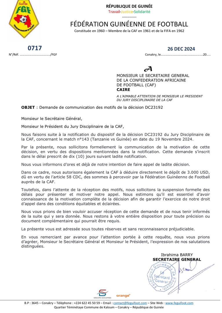 En effet, la CAF a estimé que la plainte de la Guinée était recevable sur la forme, elle l’a toutefois jugée « mal fondée » sur le fond, sans fournir de détails supplémentaires. Face à ce manque de clarté, la Feguifoot a rapidement réagi en adressant une demande officielle à la CAF pour obtenir les motifs détaillés de cette décision (référence DC23192).