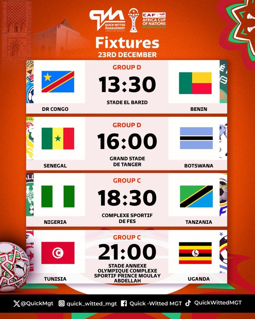 La Coupe d’Afrique des Nations 2025 se poursuit ce mardi 23 décembre au Maroc avec quatre rencontres au programme. Les Guépards du Bénin feront leur entrée dans la compétition face à la République démocratique du Congo à 13h30 (heure locale). La journée se poursuivra avec Sénégal–Botswana à 16h00, Nigeria–Tanzanie à 18h30, avant de s’achever par l’affiche Tunisie–Ouganda à 21h00. Une journée décisive pour plusieurs sélections en quête d’un bon départ dans le tournoi.