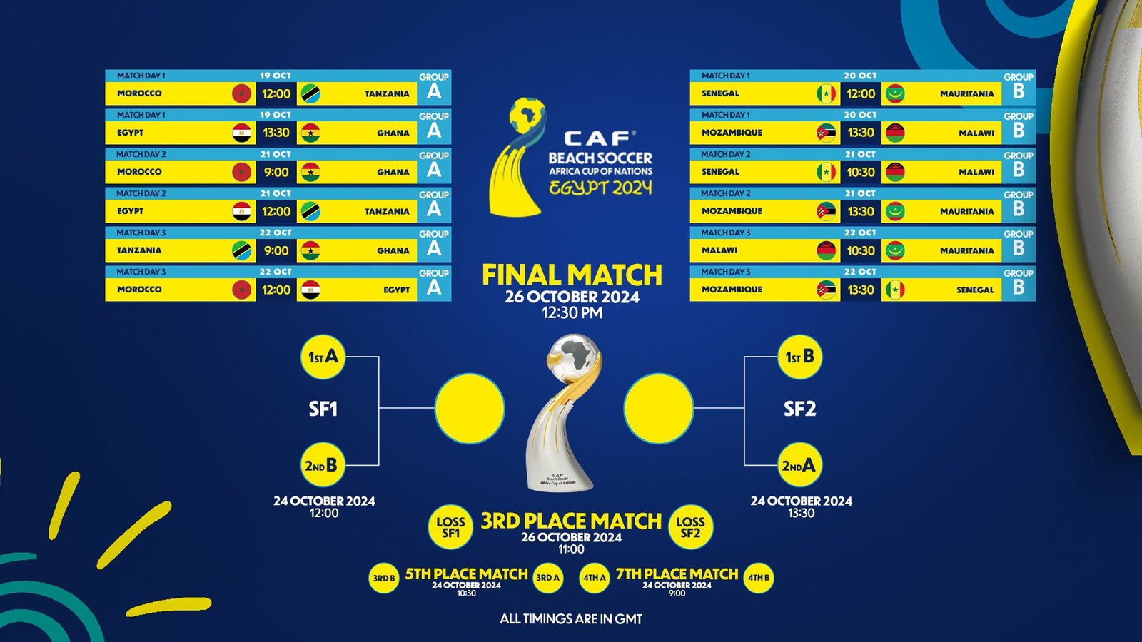 Les demi-finales se dérouleront le 24 octobre, suivies par les matches de classement pour les 5e et 6e places. Le match pour la 3e place et la finale auront lieu le 26 octobre. Les deux finalistes décrocheront leur ticket pour la Coupe du monde de Beach Soccer 2025 aux Seychelles, qui, en tant que pays hôte, est déjà qualifié, portant ainsi à trois le nombre d’équipes africaines participant au prochain Mondial.