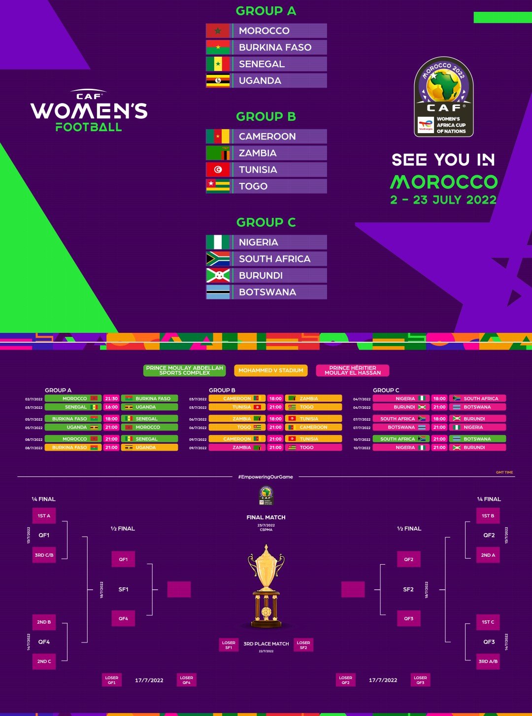 Après le tirage au sort de la phase de groupe, la CAF a officiellement dévoilé le calendrier de la Can féminine 2022. La compétition qui est prévue du 02 au 23 juillet 2022 au Maroc, verra les sélections dames africaines lutter pour décrocher le titre suprême. Découvrez le calendrier complet de l’événement.