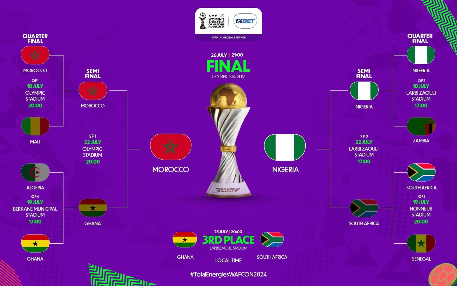 La Confédération Africaine de Football a officialisé le programme des derniers matchs de la 15e édition de la Coupe d’Afrique des Nations Féminine. Le Maroc affrontera le Nigeria en finale le samedi 26 juillet 2025 à 21h, au stade Prince Moulay Abdellah de Rabat. Les Lionnes de l’Atlas tenteront de décrocher leur premier titre continental face aux Super Falcons, septuples championnes d’Afrique.