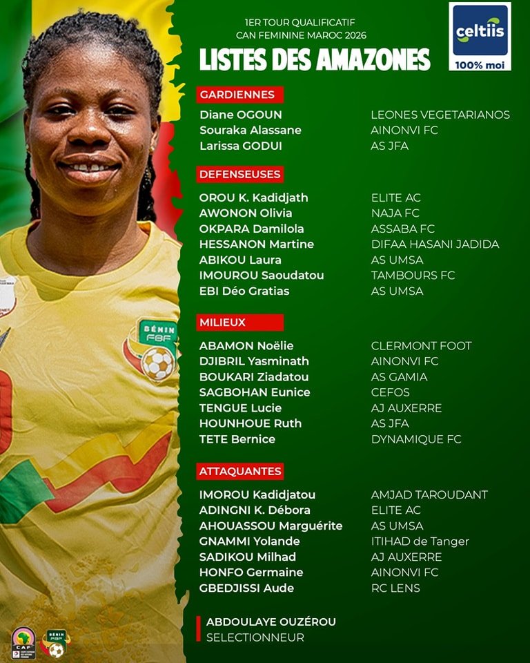 Ce mercredi 19 février 2025, la fédération béninoise de football a révélé al liste des Amazones retenues pour le premier tour des éliminatoires de CAN Féminine 2026. Le Bénin se prépare pour des matchs aller et retour contre la Sierra Leone.