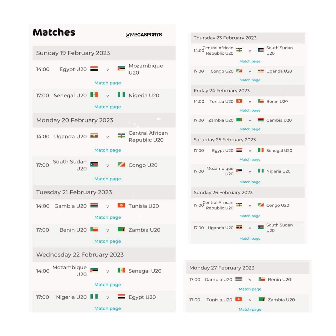 La Coupe d’Afrique des Nations des moins de 20 ans aura lieu de 19 février au 11 mars 2023 en Égypte. Voici le programme complet des matchs de phase de groupes.