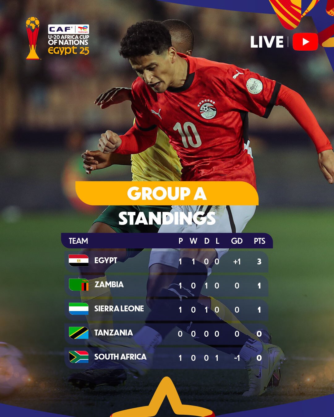 Dans le match d’ouverture disputé au stade international du Caire, l’Égypte s’est imposée 1-0 contre l’Afrique du Sud grâce à un but décisif de Mohamed Abdallah à la 62ᵉ minute. Une entrée en matière convaincante devant un public nombreux et acquis à la cause des Pharaons U20. Quelques heures plus tôt, à Ismaïlia, la Zambie n’est pas parvenue à faire sauter le verrou sierra-léonais, concédant un match nul et vierge (0-0) pour son entrée en lice dans le groupe A.