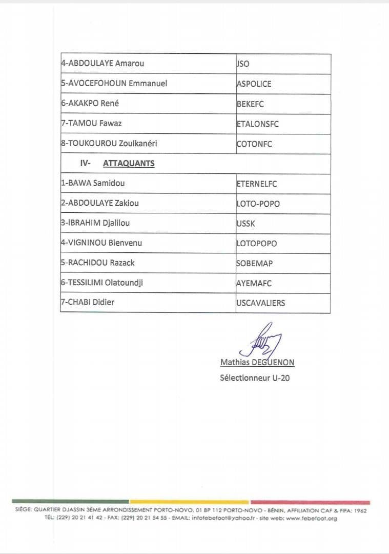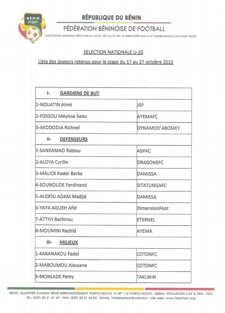 Le Bénin U20 entre en regroupement dès ce 17 octobre 2022. Ceci pour amorcer sa phase de préparation en prélude à sa participation à la coupe d’Afrique des nations u20 Egypte 2023. A cet effet, le sélectionneur Mathias Deguenon a convoqué 26 joueurs pour un premier stage qui couvre jusqu’au 27 octobre 2022.