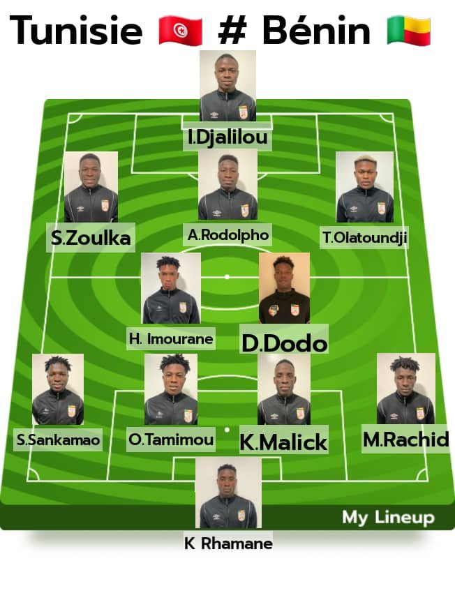 Ce vendredi 24 février 2023, le Bénin défit la Tunisie pour son deuxième match de la CAN U20 2023. Et pour cette rencontre décisive, Mathias Deguenon a effectué trois changements dans son 11  de départ par rapport au match face à la Zambie. Le gardien Agossa David laisse sa place à Karim Rahmane. Edou Farid et Samidou Bawa sont aussi remplacés par Séïbou Zoulkanéri et Ibrahim Djalilou.