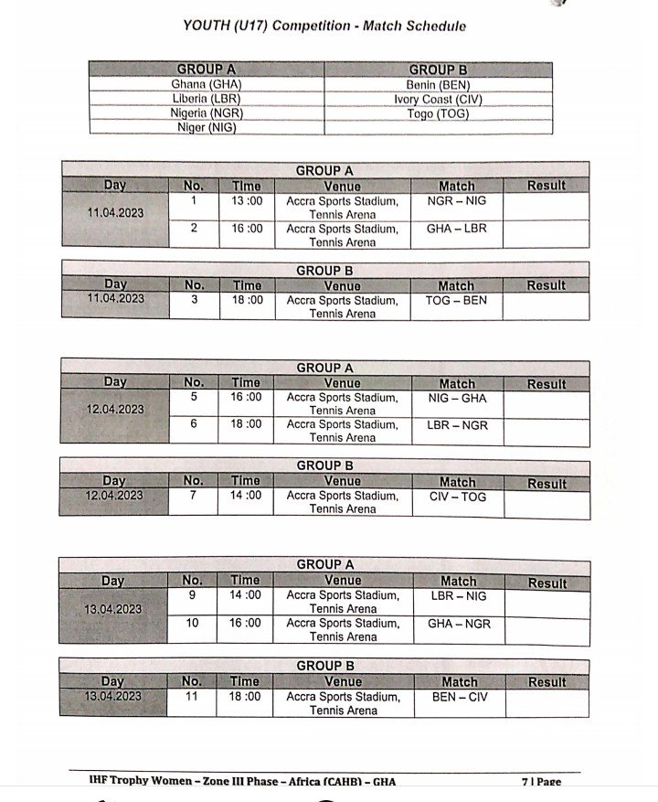 Pour cet IHF Trophy, Zone 3, Accra 2023, les Amazones cadettes et juniors sont réparties dans différents groupes.